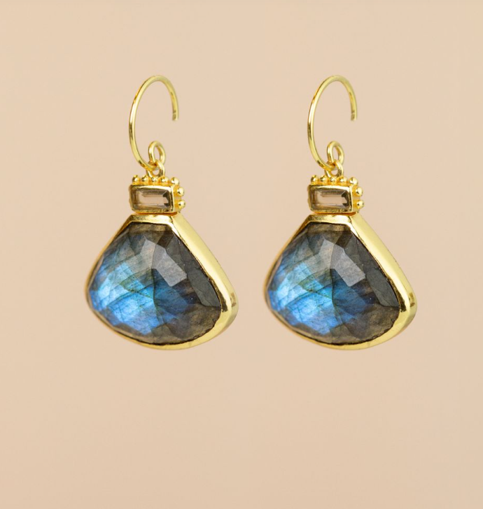 Muja Juma oorbellen met 2 edelstenen, Labradoriet en Rookkwarts. Deze oorbellen zijn handgemaakt. Het basismateriaal is zilver met een dikke laag 18 krt goud. Deze oorbellen zijn 3cm lang.