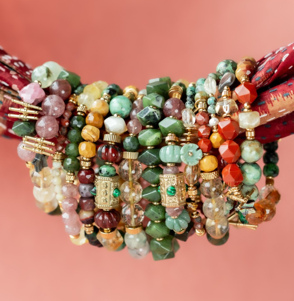Muja Juma armband met edelstenen, Prehniet. Deze armband is handgemaakt. Het materiaal van de coins is staal met een laag 18 krt goud.