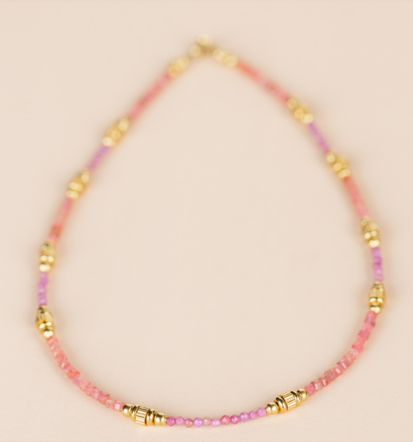 Muja Juma ketting met edelstenen, Rhodoniet, donkere Aarbeienkwarts en Phosphosideriet. Deze ketting is handgemaakt. Het basismateriaal is staal met een laag 18 krt goud. Deze ketting is 38-42cm lang.